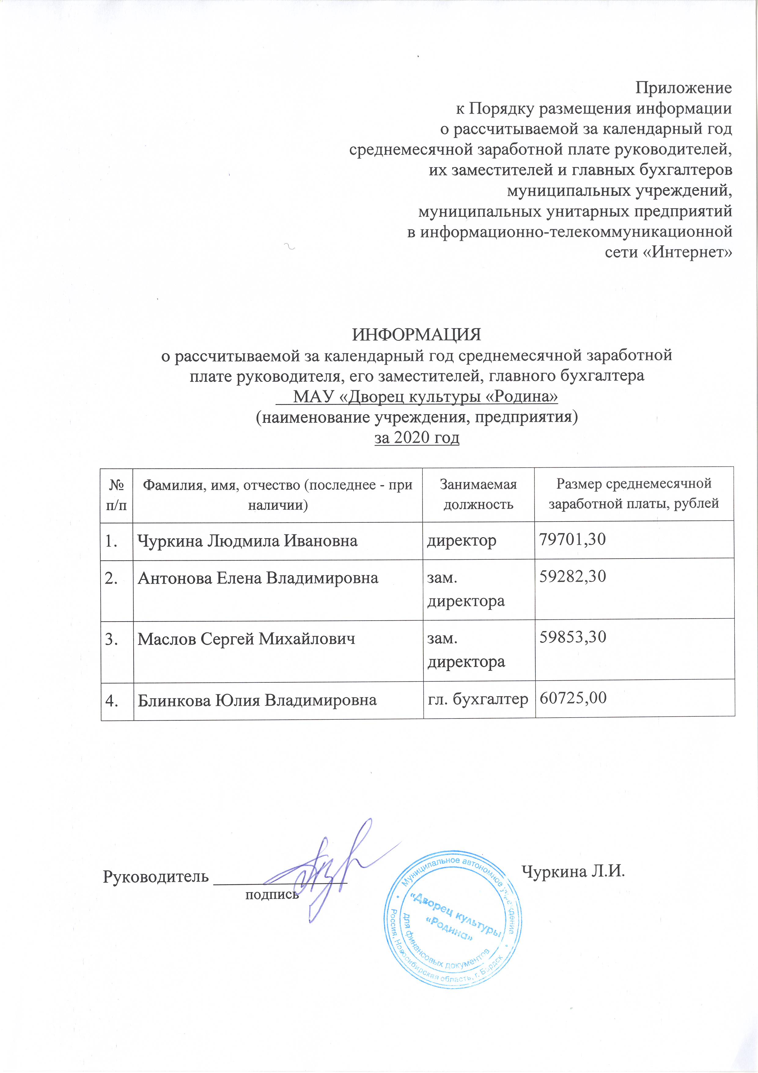 Информация о рассчитываемой за календарный год среднемесячной заработной плате руководителя, его заместителей, главного бухгалтера за 2020