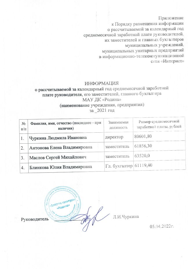 Информация о рассчитываемой за календарный год среднемесячной заработной плате руководителя, его заместителей, главного бухгалтера за 2021
