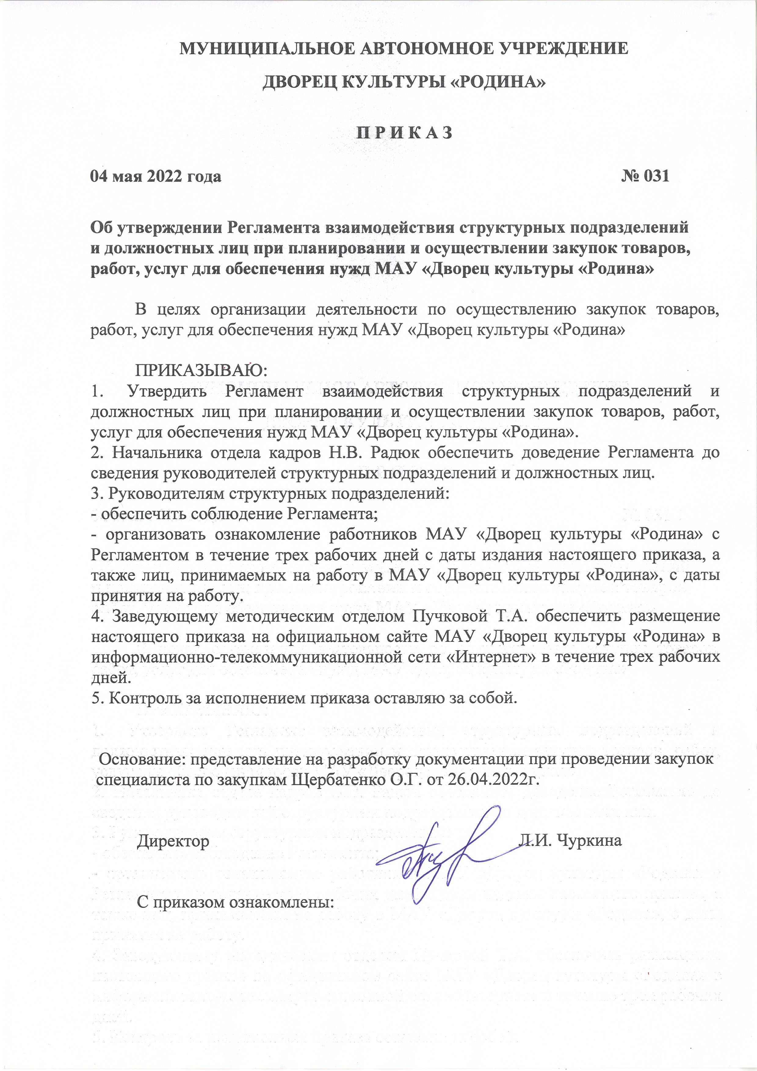 Приказ №31 от 4 мая 2022 Об утверждении Регламента взаимодействия структурных подразделений и должностных лиц при планировании и осуществлении закупок товаров, работ, услуг для обеспечения нужд МАУ «Дворец культуры «Родина»