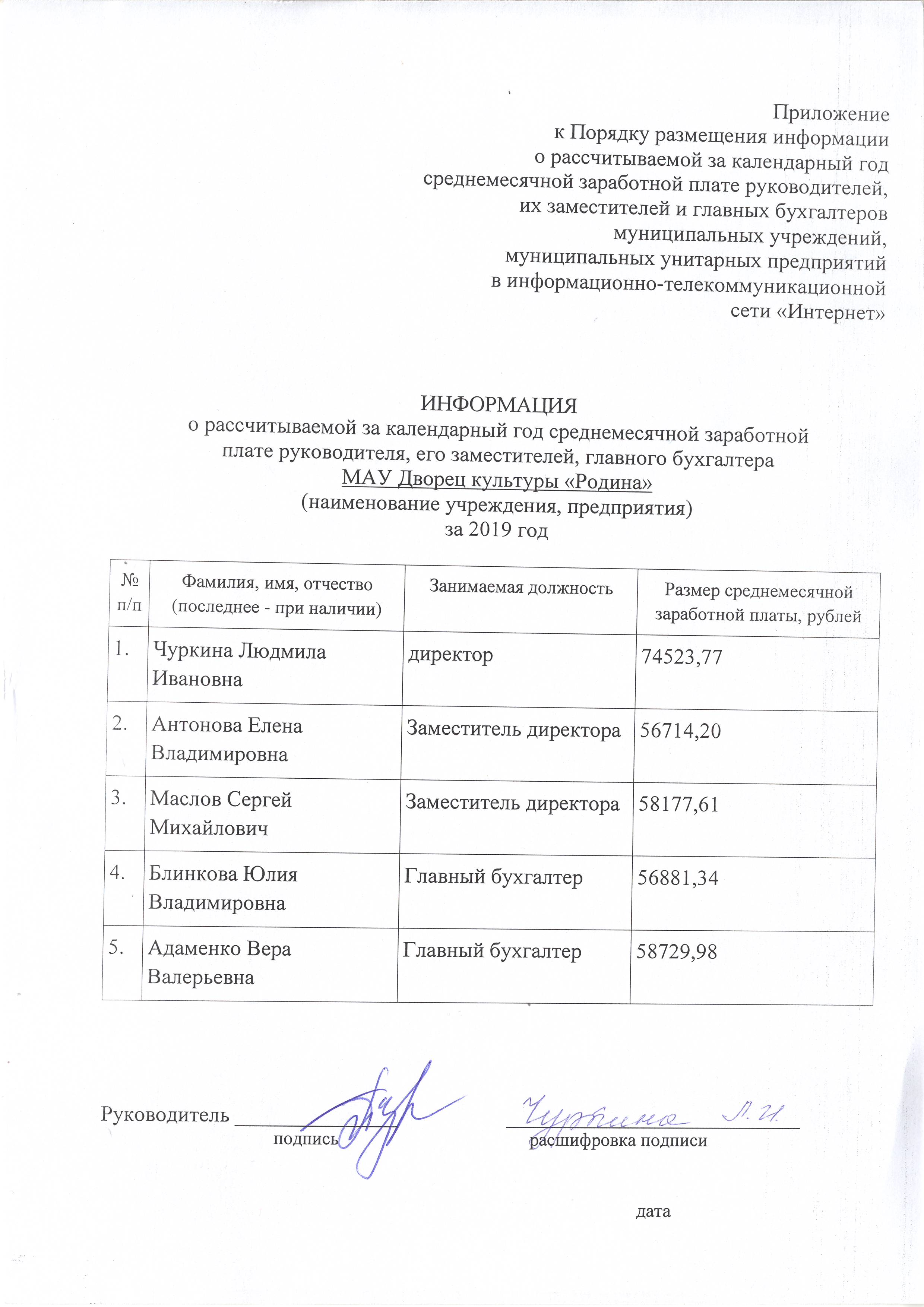 Информация о рассчитываемой за календарный год среднемесячной заработной плате руководителя, его заместителей, главного бухгалтера за 2019